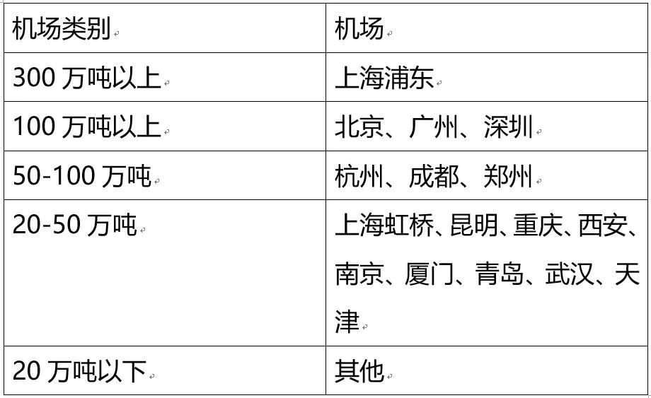 2019年貨郵吞吐量在20萬噸以上的共16個(gè)機(jī)場(chǎng),吞吐量之和占全國總量的80%,是國家航空貨運(yùn)發(fā)展的未來所在。各地機(jī)場(chǎng)按貨郵吞吐量大小可分為五類,如下表示: